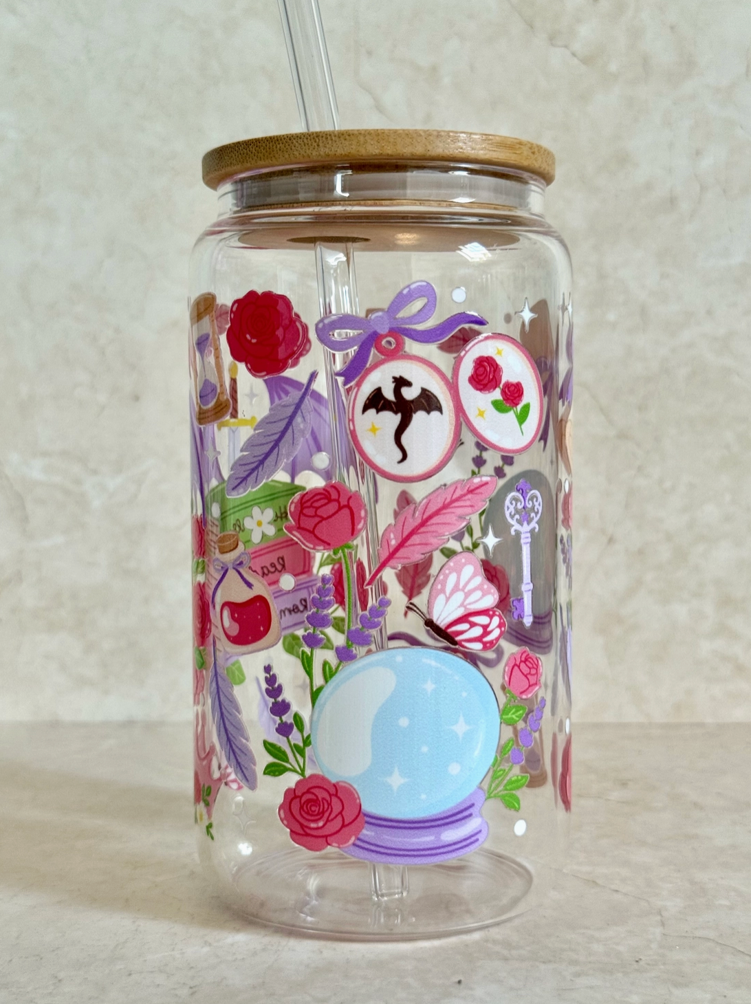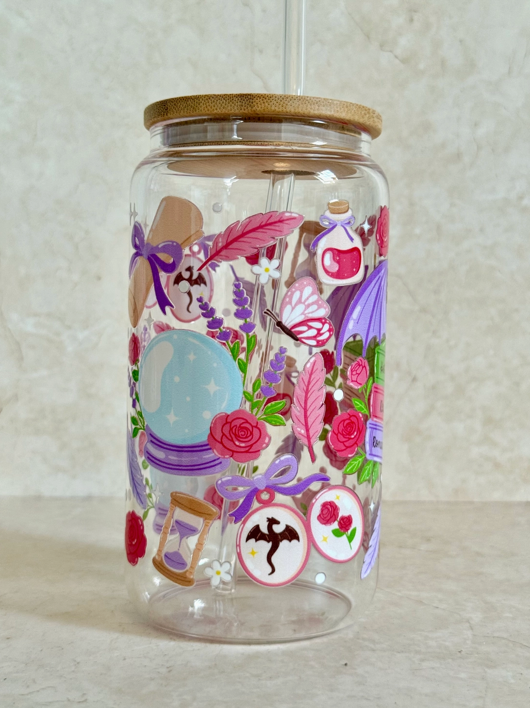 Underbara bokliga glas som verkligen förhöjer lässtämningen. Bambulock och sugrör medföljer.